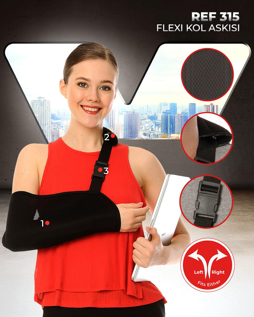 Ayarlanabilir kemeri kolu uygun ve konforlu pozisyonda tutmaya yardımcı olur.